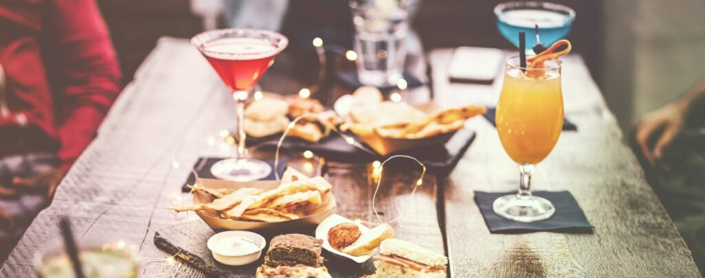 De alcoholische versie van de High tea, De thee wordt vervangen door wijn en geserveerd met hartige hapjes en of borrelplanken…